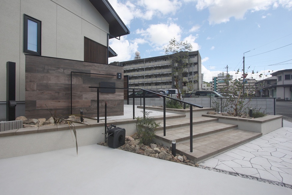 上質なエクステリアを使い、デザインした空間はシンプルなデザインの外構の中に、作り上げたデザインスペースを作る事で都会的な印象に仕上げた新築外構が完成しました。