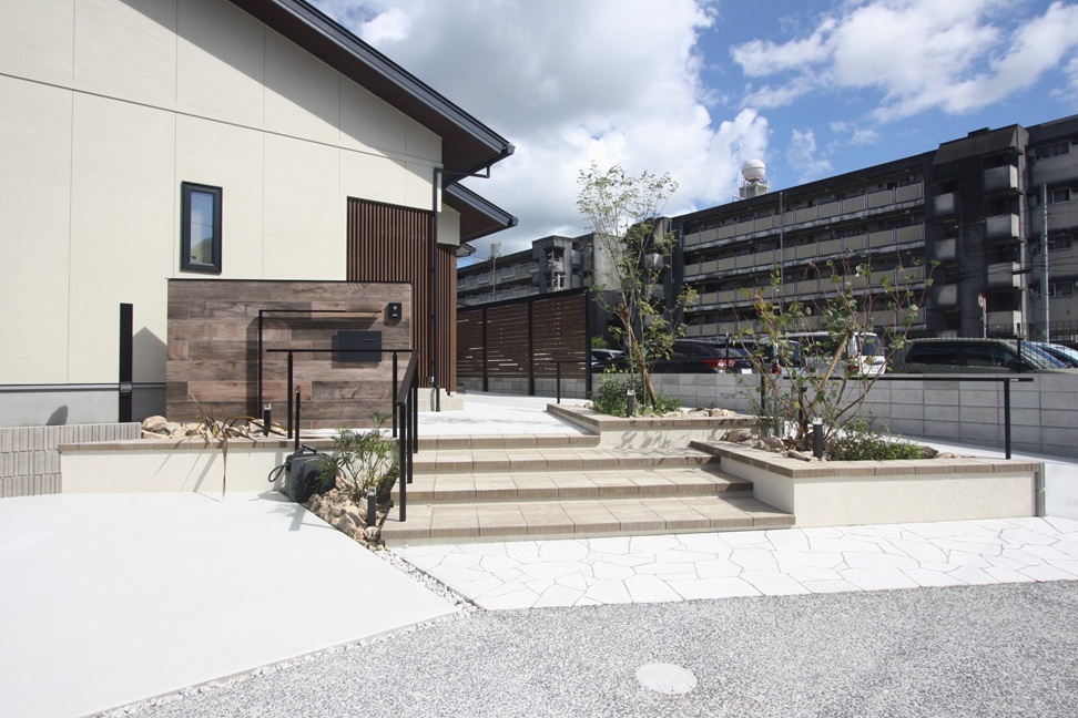 新築後、生活してみた後に外構を考えたいとご希望だった施主様はご希望も明確でした。駐車場は、敷地とお家の建築位置から道路への動線や確保する空間を考えると自然と決まって来ます。今回は、玄関横の広い空間が駐車場スペースとして最適となり来客用も含めた駐車スペースを作りました。常時お車を停める箇所にはコンクリートを施工しました。玄関が道路との距離が近いので高さを解消する階段で仕上げたアプローチ階段にはデザイン門柱、レンガで仕上げた花台を階段内に配置し シンプルながらゲストを迎える洗練された空間に仕上げました。また、門まわり横のスペースは植栽スペースとしてロックガーデンに仕上げ シンボルツリーのアオダモが、夜はスポットライトの光で陰が外壁に映し出され幻想的な空間に変身します